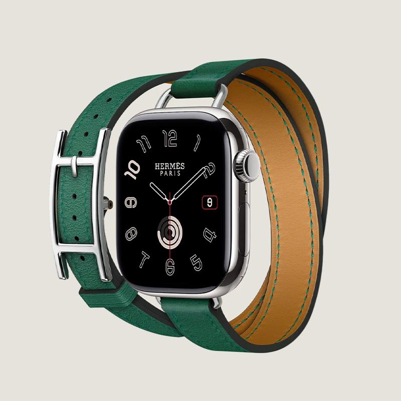 Apple Watch Hermes 11, Cellular 42mm Silver Titanium Case, Vert Moyen Hapi Attelage Double Tour. Купить Apple Watch Series 11 Hermes в Москве. Оригинальные Apple Watch 11 Hermes