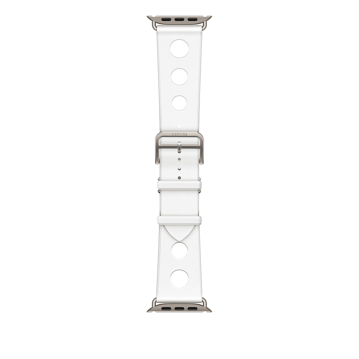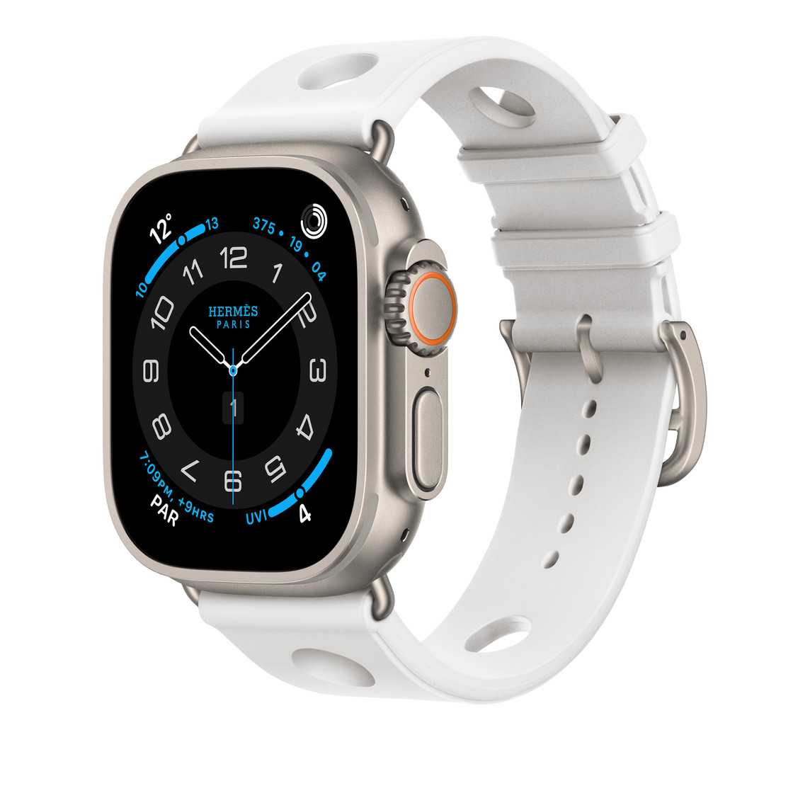 Портфолио Apple Watch Hermès, основанное на общем фундаменте мастерства и красоты, пополняется новыми культовыми моделями. Последняя коллекция предлагает путешествие на неизведанную территорию с текстилем насыщенных оттенков, роскошными материалами, деталями в морском стиле и дебютом элегантных и прочных Apple Watch Hermès Ultra 3. Новый ремешок Scub’H Diving отличается чёткими спортивными линиями и круглыми вырезами, напоминающими иллюминаторы. Изготовленный из высококачественной резины, он дышащий, исключительно лёгкий и выдерживает экстремальные водные виды спорта. Надёжная титановая застёжка придаёт изделию элегантный вид.