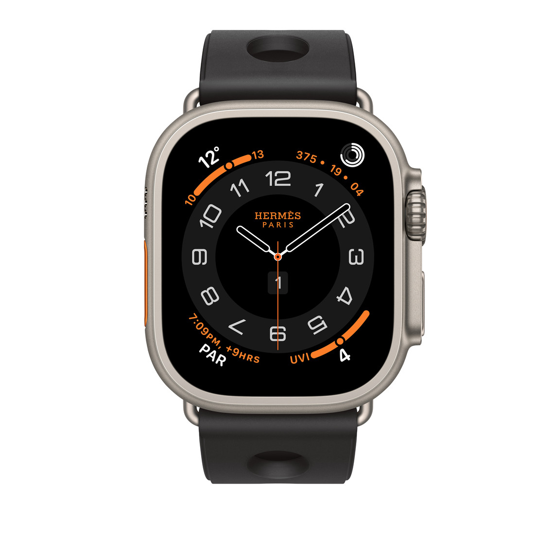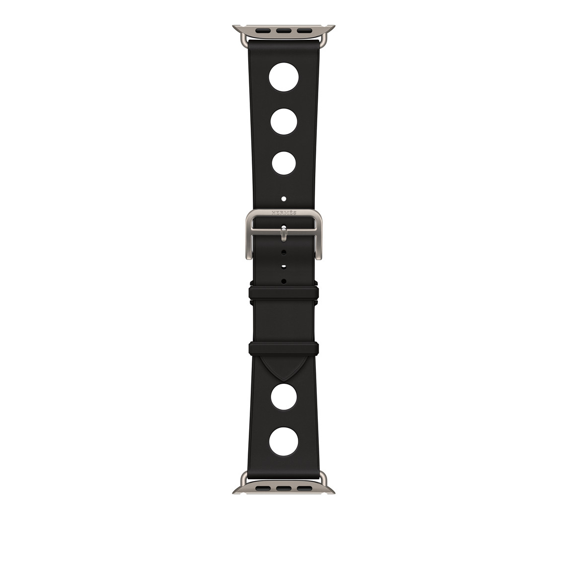 Портфолио Apple Watch Hermès, основанное на общем фундаменте мастерства и красоты, пополняется новыми культовыми моделями. Последняя коллекция предлагает путешествие на неизведанную территорию с текстилем насыщенных оттенков, роскошными материалами, деталями в морском стиле и дебютом элегантных и прочных Apple Watch Hermès Ultra 3. Новый ремешок Scub’H Diving отличается чёткими спортивными линиями и круглыми вырезами, напоминающими иллюминаторы. Изготовленный из высококачественной резины, он дышащий, исключительно лёгкий и выдерживает экстремальные водные виды спорта. Надёжная титановая застёжка придаёт изделию элегантный вид.